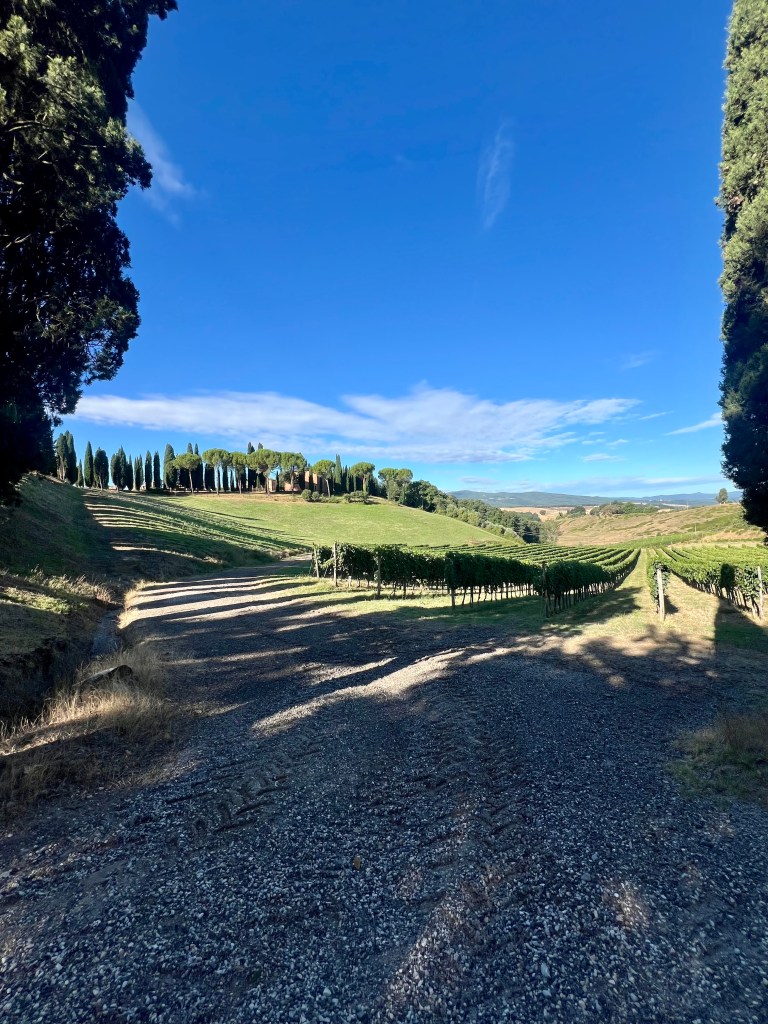 As I continued, the route opened up to sweeping vineyards typical of the Val d’Orcia region. This is prime wine country—home to some of Tuscany’s most celebrated labels, including Brunello di Montalcino and Rosso di Montalcino. You can see the well-tended rows of vines stretching across the hillsides, and occasionally catch the scent of fermenting grapes in the breeze. Some hikers take detours for tastings, and there are a few rustic wine estates where you can pause for a glass and a chat with the winemakers.