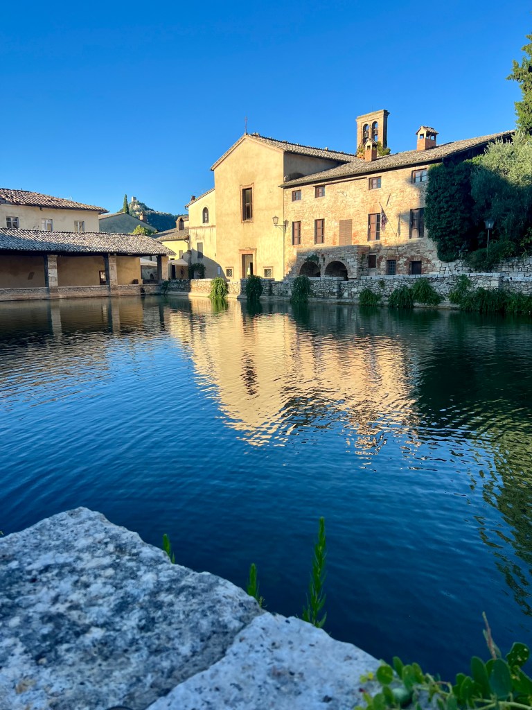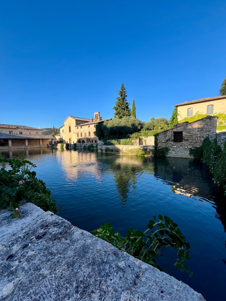 Further along the journey, I passed through Bagno Vignoni, a renowned hot spring town. The central square features an ancient thermal bath that dates back to Roman times, with steam rising from the waters against a backdrop of buildings. It was the kind of sight you see on postcards, and I couldn’t resist dipping my fingers in the warm water—a peaceful, rejuvenating moment after hours of walking.