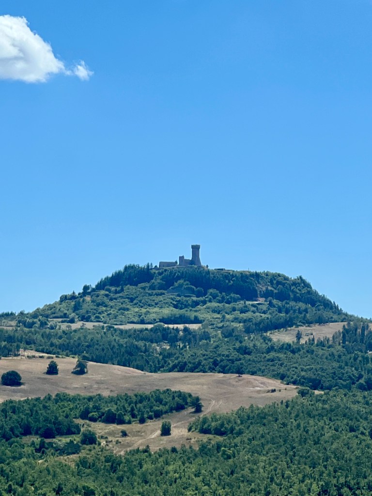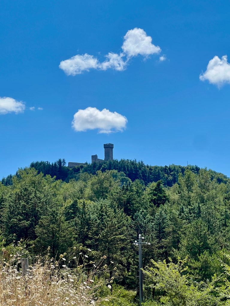 As I neared Radicofani, the climb grew steeper, and the road narrowed. The air turned cooler as I ascended, and the view opened up, revealing Radicofani’s imposing fortress sitting atop the hill. It wasn’t an easy climb (5 miles long), but it felt like I was walking toward something historic.